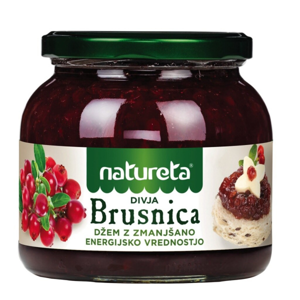 Brusnice 38 %, voda, sladkor, želirno sredstvo: pektin, antioksidant: askorbinska kislina. Izdelano iz 30 g sadja na 100 g. Skupni sladkorji 60 g na 100 g.