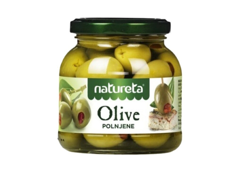Zelene olive, voda, pasta iz paprike 5 % (rdeča paprika, gostilo natrijev alginat E401, guar gumi E412, konzervans kalijev sorbat), jedilna sol, kislina citronska kislina.