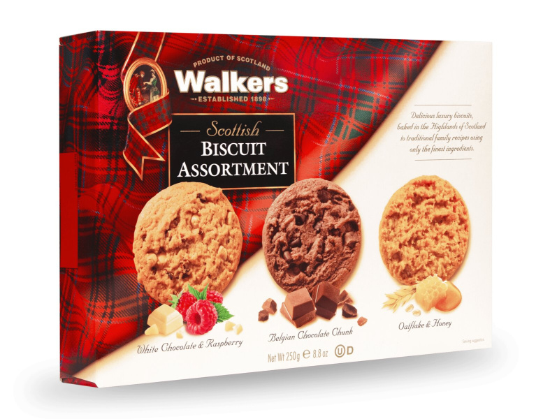 Sestavine: pšenična moka (pšenična moka, kalcijev karbonat, železo, niacin, tiamin), maslo (mleko), sladkor, oves (12%), koščki temne čokolade (5%) (sladkor, kakav, kakavovo maslo, emulagator: sojin lecitin, naravna aroma vanilije. Kakavovi deli: najmanj 39%), rastlinska olja (repično in palmovo olje), koščki bele čokolade (3%) (sladkor, polnomastno mleko v prahu, kakavovo maslo, posneto mleko v prahu, emulagator: sojin lecitin, naravna aroma vanilije. Kakavovi deli: najmanj 25%), koščki mlečne čokolade (3%) (sladkor, polnomastno mleko v prahu, kakavovo maslo, kakav, emulgator: sojin lecitin, naravna aroma vanilije. Kakavovi deli: najmanj 25%), med (1%), sredstvo za vzhajanje (natrijev karbonat, dinatrijev difosfat), invertni sladkorni sirup, maline(0,5%) sušene s postopkom zamrzovanja, posneto mleko v prahu, kakav v prahu, sol. Alergeni, vključno z žitaricami, ki vsebujejo gluten, so med sestavinami označeni krepko in podčrtano. Izdelek lahko vsebuje oreščke. Uporabno najmanj