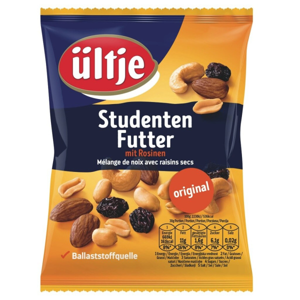 70% MEŠANICA OREŠČKOV (praženi ARAŠIDI, praženi INDIJSKI OREŠČKI, praženi MANDLJI), 30% rozin, rastlinsko olje (palmovo, sončnično). Na odstotne deleže vplivajo tehnični vzroki (nihanja) pri polnjenju. Vsebuje sledi drugih OREŠČKOV. Opozorilo: Majhni otroci se z oreščki lahko zadušijo.