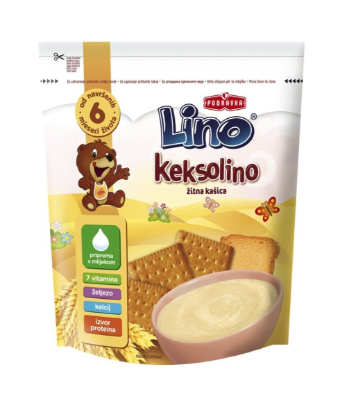 Keksi z MASLOM 33 % (PŠENIČNA moka, sladkor, cvetni med, MASLO, dekstroza, rastlinska maščoba, polnomastno MLEKO v prahu, emulgator SOJIN lecitin, aroma vanilin), PŠENIČNI zdrob, polnomastno MLEKO v prahu 17 %, sladkor, prepečenec (PŠENIČNA moka, sladkor).