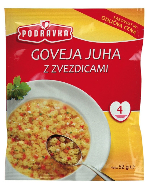Testenine 62 % (durum PŠENIČNI zdrob, JAJCA), jedilna sol, ojačevalci arome (mononatrijev glutaminat, dinatrijev inozinat, dinatrijev gvanilat), maltodekstrin, rastlinska maščoba, sušena zelenjava 3 % (pastinak, korenje, čebula, paradižnik, rdeča paprika), sladkor, koruzni škrob, goveji loj, kvasov ekstrakt, hidroliziran koruzni protein, arome, sušeni goveji mesni ekstrakt 0,5 %, začimbe, barvilo (karamel). Lahko vsebuje MLEKO in ZELENO v sledovih.