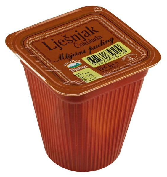 Pasterizirano MLEKO, SMETANA, sladkor, modificirani koruzni škrob, LEŠNIK v prahu 1 %, manj masten kakavov prah 0,95 %, posneto MLEKO v prahu, gostila: karagenan in guar gumi, arome, kalcijev karbonat, vitamin D.