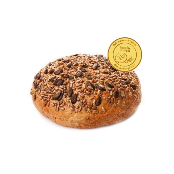 PŠENIČNA polbela moka, voda, semena 15% (bučna, sončnična, lanena, SEZAMOVA), PŠENIČNO kislo testo (voda, PŠENIČNA polbela moka, starter kultura), RŽENA moka tip 1250, PŠENIČNA polnozrnata moka, PŠENIČNA bela moka, sončnično olje, PŠENIČNI gluten, kvas, jodirana sol, pražena PŠENIČNA sladna moka, encimi.