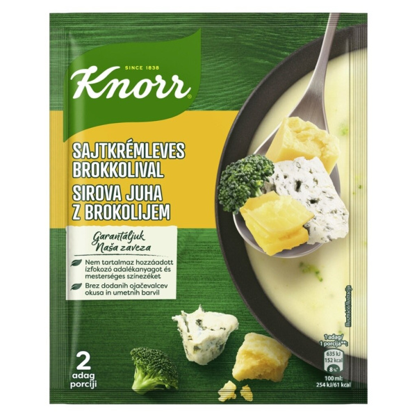 Škrob (krompirjev, koruzni), topljeni SIR 24 % (SIR, GORGONZOLA 4,7 %, MOZZARELLA, modri SIR, trdi SIR 1 %, CRESCENZA, šalotka), palmina maščoba, jedilna sol, SMETANA v prahu, hidrolizirane rastlinske beljakovine, sušeni brokoli 2,2 %, LAKTOZA, začimbe (česen, poper, muškatni orešček, kurkuma), čebula v prahu, MLEČNE beljakovine, sladkor, ekstrakt kvasa, aroma (vsebuje MLEKO), timijan, maltodekstrin. Lahko vsebuje GLUTEN, JAJCA in ZELENO.