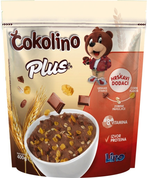 Instant žitni kosmiči s čokolado 60 % [ŽITA 62,1 % (PŠENIČNI zdrob, PŠENIČNA moka), sladkor, čokolada v prahu 17,6 % (sladkor, kakavov prah, kakavovo maslo, emulgator SOJIN lecitin), vitamini (vitamin C, niacin, pantotenska kislina, vitamin B6, vitamin B2, vitamin B1, folna kislina, vitamin B12)], OVSENI kosmiči 15 %, koruzni kosmiči 12,5 % (koruzni zdrob 94 %, sladkor, kuhinjska sol, sladni ekstrakt JEČMENA), hrustljavi riž s čokolado 12,5 % [rižev zdrob 40 %, PŠENIČNI zdrob, sladkor, kakavov prah, posneto MLEKO v prahu, čokolada v prahu 3,2 % (sladkor, kakavov prah, kakavovo maslo, emulgator: SOJIN lecitin), dekstroza, kuhinjska sol, aroma].