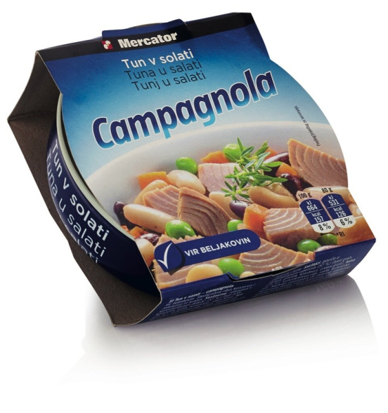 Zelenjava v spremenljivem deležu (57 %) (beli fižol, korenček, grah, kumarice, rdeči fižol), TUN (25 %), sončnično olje, voda, jedilna sol.