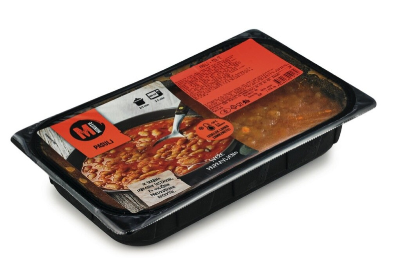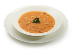 Fižol beli, voda, sončnično olje, čebula, pečena slanina (mesnata slanina (80 %), voda, ne jodirana morska sol, dekstroza, stabilizator: trifosfat, gostilo: predelana morska alga eucheuma, antioksidant: natrijev askorbat, naravne arome, konzervans: natrijev nitrit), PŠENIČNA moka, česen, jedilna sol, konc. goveja juha (jodirana sol 43,8 % ((sol, kalijev jodat 0,007 %), koruzni maltodekstrin, ekstrakt kvasa, naravne arome, sončnično olje, goveji ekstrakt 1,8 %, arome, koruzni škrob, ZELENA, čebula, kurkuma, muškatni orešček, beli poper), sladka paprika mleta, paradižnikova mezga, lovor, poper, aroma. Lahko vsebuje sledi JAJC, MLEKA, RIB, GORČICE, SEZAMA in SOJE.