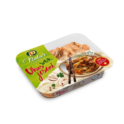 Piščančji file, voda, rastlinsko olje, šampinjoni, kuhinjska sol, sladkor, začimbe, kis, modificiran škrob, mlečni proteini, arome, sredstvo za zgoščevanje: E412, E415, laktoza, karamel.Hraniti pri temperaturi od –2°C do +4°C.Izdelek vsebuje laktozo. Pakirano v kontrolirani atmosferi.
