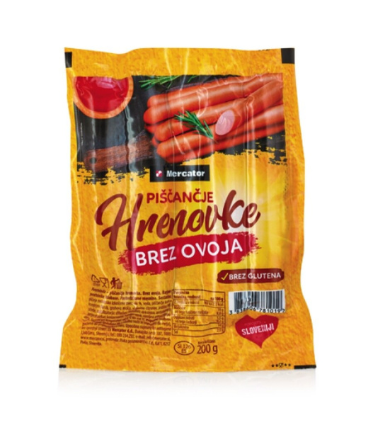 Piščančje hrenovke brez ovoja, Mercator, pakirano, 200 g