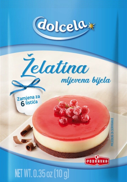 Zmešajte vsebino vrečke s 5 žlic hladne vode. Namakajte v vodi 10 minut. Med mešanjem segrevajte (ne kuhajte), dokler se želatina popolnoma ne raztopi.