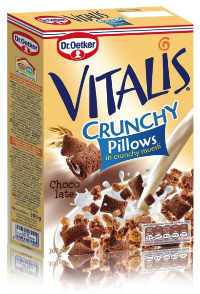 Polnozrnati OVSENI kosmiči 35 %, sladkor, nadev z okusom čokolade 9,5 % (sladkor, rastlinska maščoba (palmina, karitejeva), kakavova masa, posneto MLEKO v prahu, krompirjev škrob, SIROTKA v prahu, kakav v prahu, emulgator (SOJIN lecitin), aroma), PŠENIČNA moka, palmino olje, polna MLEČNA čokolada 5 % (sladkor, polno MLEKO v prahu, kakavova masa, kakavovo maslo, sladka SIROTKA v prahu, emulgator (lecitini)). Kakavovi deli v polni MLEČNI čokoladi: najmanj 30 %, koruzna moka, glukozni sirup, riževa moka, polnozrnata PŠENIČNA moka, manj masten kakav v prahu 2,7 %, PŠENIČNI zdrob, koruzni kosmiči (sladka koruza, sladkor, sol, ekstrakt JEČMENOVEGA slada, PŠENIČNE vlaknine, PŠENIČNI GLUTEN, posneto MLEKO v prahu, aroma. Hrustljave blazinice 24 %. Lahko vsebuje sledi OREŠKOV.