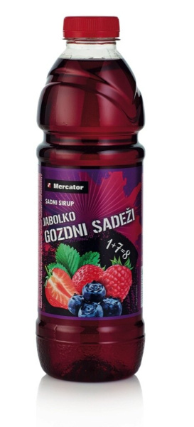 Sladkor, voda, jabolčni sok iz zgoščenega sadnega soka jabolk (8%); malinov sok iz zgoščenega sadnega soka malin (0,6%), jagodni sok iz zgoščenega sadnega soka jagod (0,3%), borovničev sok iz zgoščenega sadnega soka borovnic (0,4%), kislina: citronska kislina; koncentrat hibiskusa, koncentrat črnega korenja, barvilo: antocianini, karoteni; stabilizatorja: E414, E445; antioksidant: askorbinska kislina, arome.
