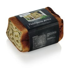 PŠENIČNA bela moka, JAJCA, kisla SMETANA, sladkor, SKUTA, voda, margarina (rastlinski maščobi (palma, kokos), SOJINO olje, voda, jedilna sol, emulgatorja: E 471, SOJIN lecitin, konzervans: E 200, sredstvo za uravnavanje kislosti: citronska kislina, aroma, barvilo: beta karoten), pripravek za pripravo kreme z okusom vanilije (sladkor, modificiran škrob, sladka SIROTKA v prahu, palmina maščoba, glukozni sirup, gostili: E 401 in E 412, MLEČNE BELJAKOVINE, JAJČNI beljak v prahu, jedilna sol, stabilizator: E 450, aroma, barvili: beta karoten in E 171), JAJČNI rumenjak, aroma ruma, kvas, posneto MLEKO v prahu, suh pehtran (0,5 %), jedilna sol, arome, konzervans: kalijev sorbat. Lahko vsebuje sledi SOJE, OREŠKOV in SEZAMA.