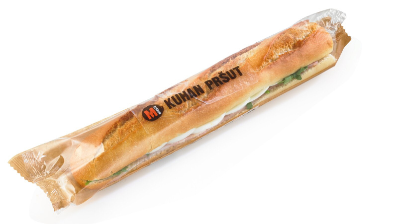 Baguetta (PŠENIČNA bela moka, voda, jedilna sol, kvas, PŠENIČNI slad), kuhan pršut 20,5 % (svinjsko meso I. kat. (84 %), voda, kuhinjska sol, gostilo (E407), začimbe, sladkor, stabilizatorji (E450, E451), antioksidanti (E316), konzervans (E250), ojačevalec arome (E621)), JAJCA, rukola in hrenov namaz (hren 25 %, SMETANA 23 %, repično olje, voda, sladkor, alkoholni kis, dekstroza, MLEČNE beljakovine, satbilizatorja guar gumi in ksantan gumi, jedilna sol, kislina citronska kislina, antioksidant natrijev METABISULFIT)). Lahko vsebuje sledove RIB, ZELENE, GORČICE in SEZAMA.