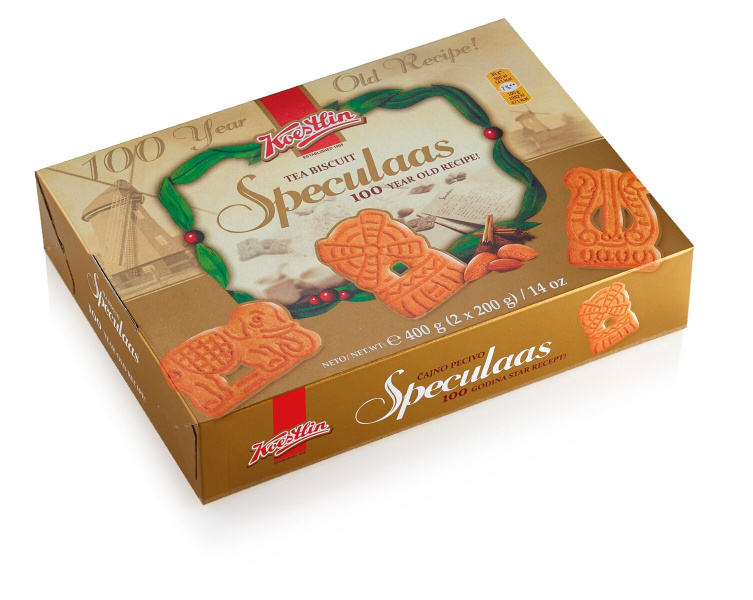 PŠENIČNA moka, sladkor, palmina maščoba, praženi mandelni 5 %, SIROTKA v prahu (iz MLEKA), manj masten kakavov prah, sredstvo za vzhajanje amonijevi karbonati, začimbe. Lahko vsebuje soju, ARAŠIDE in OREŠKE.
