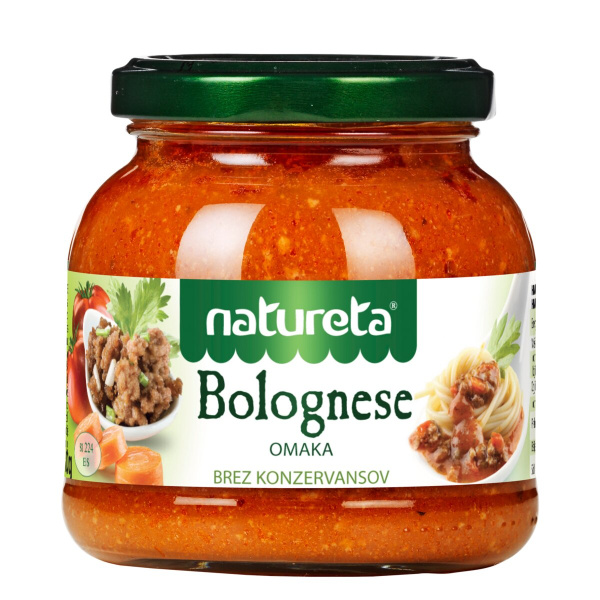 Paradižnikovi pelati v koščkih 56 %, praženo goveje meso z zelenjavo 14 % (goveje meso 85 %, korenje 4 %, ZELENA 4 %, čebula 4 %m olje oljne ogrščice), voda, čebula, paradižnikov koncentrat, mešano rastlinsko olje v sprejemljivem deležu (sončnično in oljčno olje), korenje 1 %, sončnično olje, ZELENA 1 %, jedilna sol, sladkor, začimbe. Lahko vsebuje sledi, MLEKA, JAJC, SOJE in GORČICE.