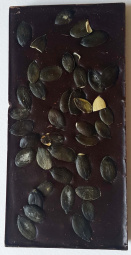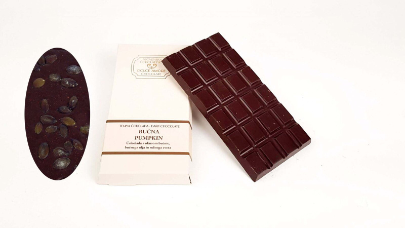 Ročno izdelana temna čokolada »BUČNA« Sestavine: temna čokolada: kakavovi deli: najmanj 55%,kakavova masa, sladkor, kakavovo maslo, bučnice, bučno olje, solni cvet, vanilija, emulgator: SOJIN lecitin, Lahko vsebuje sledi SEZAMA, LUPINASTEGA SADJA, OREŠČKOV, MLEKA, JAJČNIH IN PŠENIČNIH BELJAKOVIN.