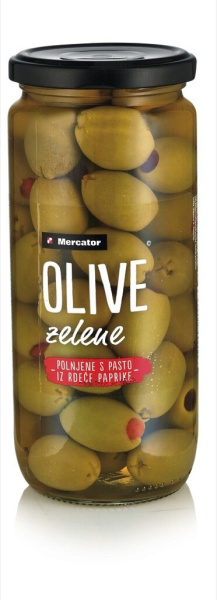 Zelene olive polnjene s pasto iz rdeče paprike, Mercator, 510 g