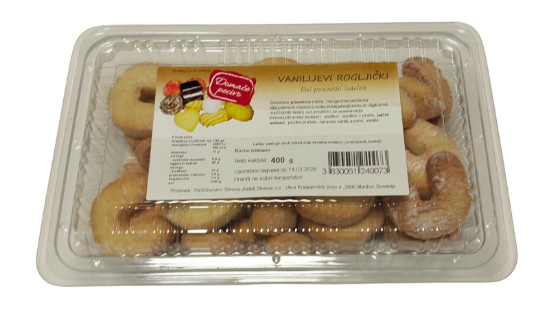 pšenična moka, rastlinske maščobe (palmove, kokosova), sojino olje, voda, kuhinjska sol 0,4 %, emulgator (sojin lecitin, E471), konzervans (E200), sredstvo za uravnavanje kislosti (citronska kislina), aroma, barvilo (beta karoten), sladkor, jajca, vanilin, koruzni škrob, kisli natrijev pirofosfat, natrijev bikarbonat
