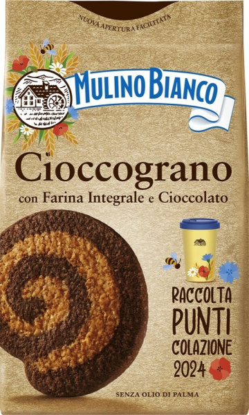 PŠENIČNA polnozrnata moka 29,1%, PŠENIČNA bela moka 27,0%, sladkor, MASLO, rastlinska olja (sončnično, olje koruznih kalčkov, repično, sojino), sveža JAJCA, čokolada 3,3% (sladkor, kakavova masa, manjmasten kakav, aroma), kakav 2,3%, PŠENIČNA vlakna, med, posneto MLEKO v prahu, sol, sredstvi za vzhajanje: natrijevi karbonati, amonijevi karbonati; arome. Lahko vsebuje sledi OREŠČKOV, SEZAMA in SOJE. PIŠKOTI MULINO BIANCO SO NAREJENI BREZ UPORABE KONZERVANSOV.