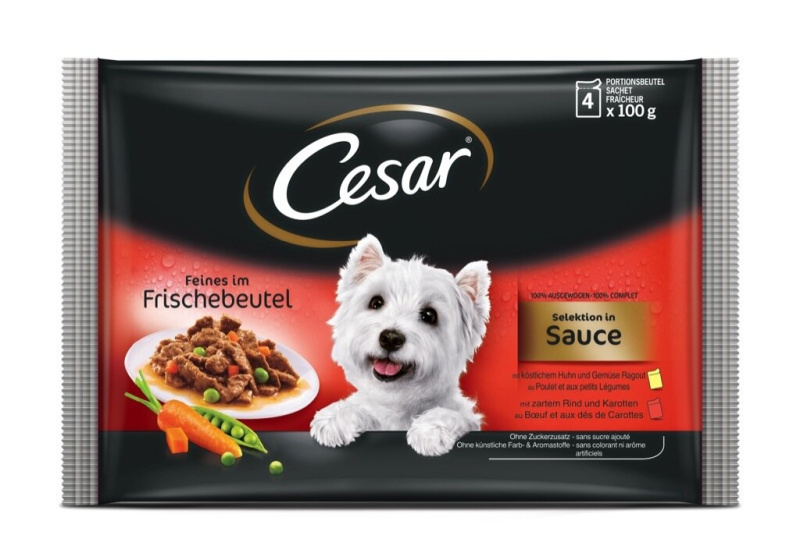 Pasja hrana s piščancem in zelenjavnim ragujem/govedino in korenje v omaki, Cesar, 4 x 100 g