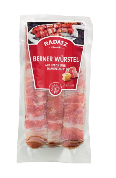 Klobasa za pečenje, polnjena s sirom ementaler in ovita s slanino, Berner Radatz, 300 g