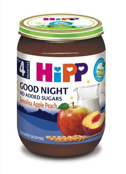 MLEČNI pripravek (MLEKO* 40 %, voda, repično olje*), jabolčni sok* z nizko vsebnostjo kislin iz koncentrata 19 %, breskve 12 %, PŠENIČNI zdrob* 5 %, jabolka* 2 %, rižev škrob*, polnovredni žitni kosmiči* 1 % (PŠENICA*, PIRA*, OVES*), sredstvo za uravnavanje kislosti: kalcijev karbonat, vitamin B1, vitamin A, vitamin D. *iz kontrolirane ekološke pridelave.