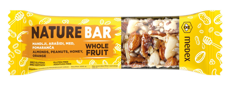 Ploščica Nature, pomaranča, med, mandlji in arašidi, Medex, 40 g