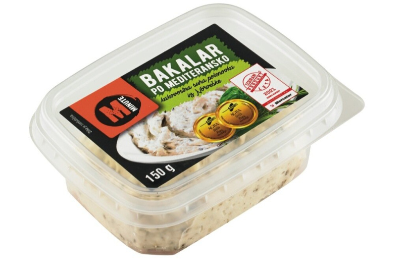 Sončnično olje, suha POLENOVKA (21 %) (Gadus morhua, poreklo Norveška), voda, jedilna sol, mediteranska mešanica začimb (0,5 %), poper, česen.