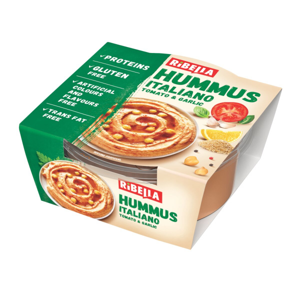Čičerika 40 %, voda, rastlinsko olje (repično, oljčno), paradižnikov pire 12 %, SEZAMOVA pasta, zelenjava (korenček, čebula), česen v prahu 1,5 %, začimbe in izvlečki začimb, jedilna sol, sredstvo za uravnavnje kislosti (citronska kislina, natrijev bikarbonat), sladkor 0,3 %, konzervans (kalijev sorbat).