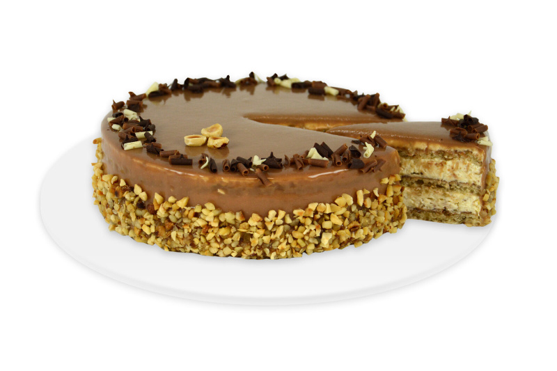 lešnik 31%, bela krema za punjenje (nehidrogenizovana biljna ulja(suncokreta) i masti(palme),obrano mleko u prahu,surutka u prahu,aroma(vanilin)),krem za pripremanje šlaga na bazi biljnih masti (25%)(voda, hidrogenizovana palmina mast 25%,šećer,mlečni protein,emulgator(sojin lecitin)),voda,jaja,lešnik krem 7%( lešnik 3%, surutka u prahu,sojino brašno,obrano mleko u prahu (min. 5% bezmasne suve materije mleka), čokolada u prahu 1%, emulgator: sojin lecitin), šećer,baza za fil (pšenično brašno,kukuruzni skrob,modifikovani krompirov skrob,surutka u prahu),mlečna krem tabla (bezmasna SM mleka min.12%,šećer, hidrogenizovana biljna mast (palme),surutka u prahu,mleko u prahu,sojino brašno,emulgator sojin lecitin), kakao tabla za jelo i kuvanje (šećer, hidrogenizovana palmina mast,kako prah sa redukovanjim sadržajem kakao maslaca (10-12%),emulgator sojin lecitin), pšenično brašno,margarin(mešavina biljnih masti i ulja(palma,suncokret,kokos,soja,kukuruz),mešavina delimčnohidrogenizovanih ulja i masti(soja,palma)),glukozni sirup,prezle(pšenično brašno), čokoladna dekoracija (šećer,kakao maslac, punomasno mleko u prahu,surutka u prahu,laktoza,emulgator sojin lecitin), konzervans kalijum sorbat