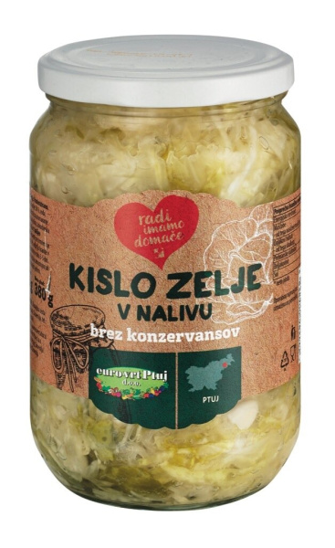 Kislo zelje 58 %, voda, jodirana sol, sredstvi za uravnavanje kislosti: citronska kislina, askorbinska kislina, antioksidant: kalijev METABISULFIT.