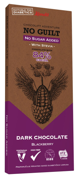 Kakavova masa, prehranske vlaknine 29 % (dekstrin, inulin, oligofruktoza), kakavovo maslo, sladilo: eritritol; manj masten kakav v prahu, emulgator: SOJIN lecitin; naravna aroma vanilije, sladilo: steviol glikozidi). Čokolada vsebuje; kakavovi delci 84 %. Lahko vsebuje MANDLJE, LEŠNIKE, ARAŠIDE, JAJCE, MLEKO in GLUTENA v sledeh.