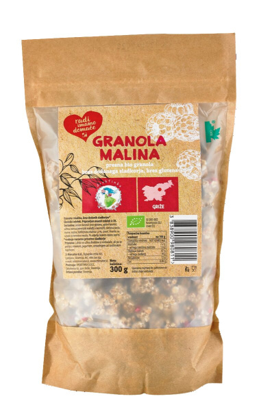 OVSENI kosmiči brez glutena*, ajdovi kosmiči**, zemeljski MANDLJI**, datljeva pasta**, murve**, rozine**, liofilizirane maline** 1,2 %, cejlonski cimet***sestavine so ekološke pridelave. ** sestavine so ekološke in presne pridelaveBrez dodanega sladkorja. Vsebuje naravno prisotne sladkorje. *iz kontrolirane ekološke pridelave.