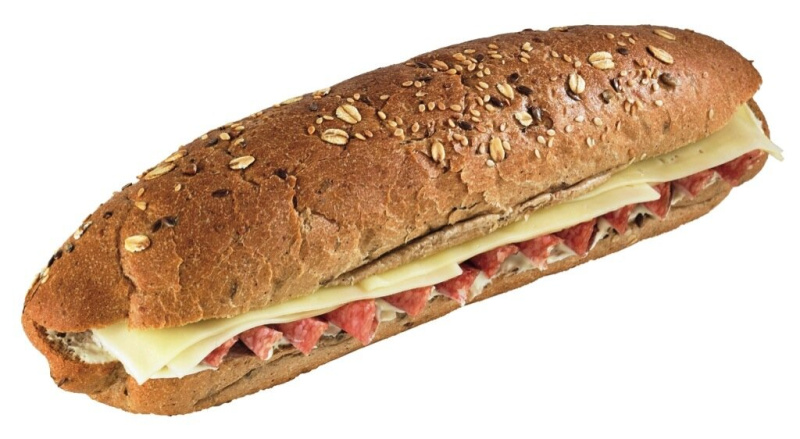 Zrnata štručka (PŠENIČNA bela moka, voda, RŽENA moka, semena 8 % (lanena, sončnična, SEZAMOVA), PŠENIČNI drobljenec, kristalni sladkor, mastna emulzija (rastlinska olja (palmovo, repično), kvas, jedilna sol, PŠENIČNO kislo testo, emulgatorja (E471, E322), regulator kislosti (E330), konzervans (E202), barvilo (E160b), sredstvo za obdelavo moke (E300), encimi), SIR 14,7 % (pasterizirano MLEKO, sol, sirišče, sirarske kulture), suha salama 12,6 % (svinjsko meso in slanina, goveje meso, jedilna sol, MLEKO v prahu, začimbe in ekstrakti začimb, dekstroza, konzervans (E250), starter kultura), kisla SMETANA, GORČICA. Lahko vsebuje sledi SOJE, RIB, OREŠKOV, JAJC in ZELENE.