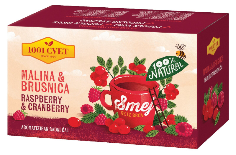 Sadni čaj, brusnica in malina, 1001 Cvet, 20 vrečk, 50 g