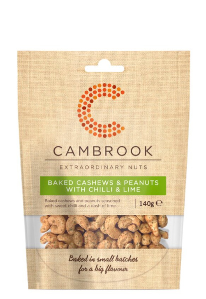 Praženi indijski oreščki in arašidi s čiliji in limeto, Cambrook, 140 g