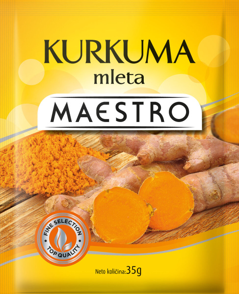 Kurkuma mleta. Lahko vsebuje sledi: PŠENIČNE moke, ZELENE, MLEKA in JAJC.