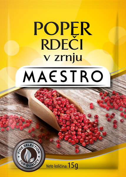 Poper rdeči v zrnju. Lahko vsebuje sledi PŠENIČNE moke, ZELENE, MLEKA in JAJC.