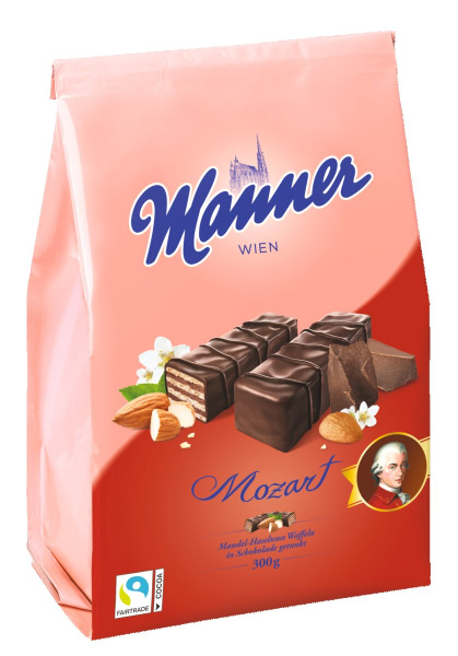 Vaflji z mandljevo-lešnikovo kremo (57 %) obliti s čokolado (30 %) • Sestavine: sladkor, pšenična moka, rastlinski maščobi (kokosova, palmina), kakavova masa, kakavovo maslo, glukozni sirup, polnomastno mleko v prahu, manj masten kakav v prahu, sirotkin izdelek, mandljeva kaša (2%), lešniki (2%), maslena maščoba, naravne arome, emulgator: lecitini (soja); sredstvo za vzhajanje: natrijev hidrogenkarbonat; sol. Kakavovi deli v čokoladi: najmanj 50 %. Lahko vsebuje sledove drugih oreškov. Hraniti na suhem pri sobni temperaturi. Uporabno najmanj do: datuma označenega na zadnji strani.