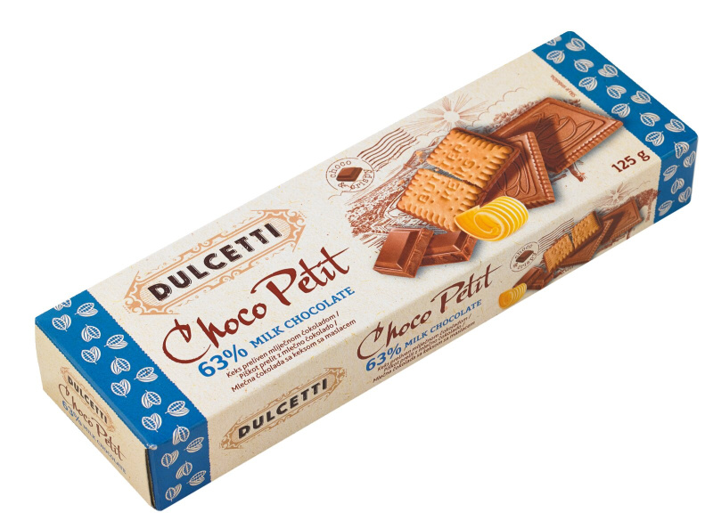 Sladkor, PŠENIČNA moka, kakavovo maslo, kakavova masa, posneto MLEKO v prahu, MASLO 4 %, LAKTOZA, glukozni sirup, MASLENO olje, sredstva za vzhajanje: natrijev hidrogenkarbonat, amonijev hidrogenkarbonat; emulgator: lecitini (SOJA); polno MLEKO v prahu, sladka SIROTKA v prahu, sol, kislina: citronska kislina. Lahko vsebuje sledi OREŠKOV. Hranite na hladnem in suhem mestu. Po odprtju porabite v roku 2 dni. V mlečni čokoladi kakavovi deli: najmanj 30 %.