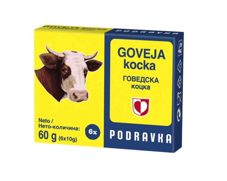 Jedilna sol, palmovo olje, ojačevalci arome (mononatrijev glutamat, dinatrijev inozinat, mononatrijev gvanilat), sladkor, koruzni škrob, goveja maščoba, sušena čebula, karameliziran sladkor, sušeni goveji mesni izvleček 0,6 %, hidrolizirane koruzne beljakovine, izvleček kvasa, aroma, maltodekstrin, začimbe, list peteršilja. Lahko vsebuje PŠENIČNO moko, ZELENO, MLEKO in JAJCA v sledovih.