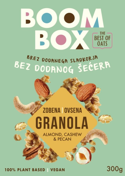 OVSENI kosmiči 60 %, oligofruktozni sirup, sladilo (maltitol), OREŠKI 7 % (MANDELJ, LEŠNIK, INDIJSKI OREŠČKI, ameriški OREŠKI), rastlinsko olje (repično), PŠENIČNI kosmiči, kokos 2 %, PŠENIČNA polnozrnata moka, maltodekstrin, semena kvinoje, lanena semena, naravne arome, emulgator (SOJIN lecitin), jodirana sol.