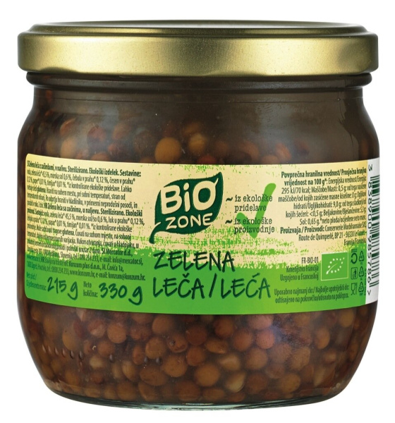 Voda, zelena leča* 45,5 %, morska sol 0,6 %, čebula v prahu* 0,12 %, poper* 0,01 %, timijan* 0,01 %. *iz kontrolirane ekološke pridelave. Lahko vsebuje sledi GLUTENA.
