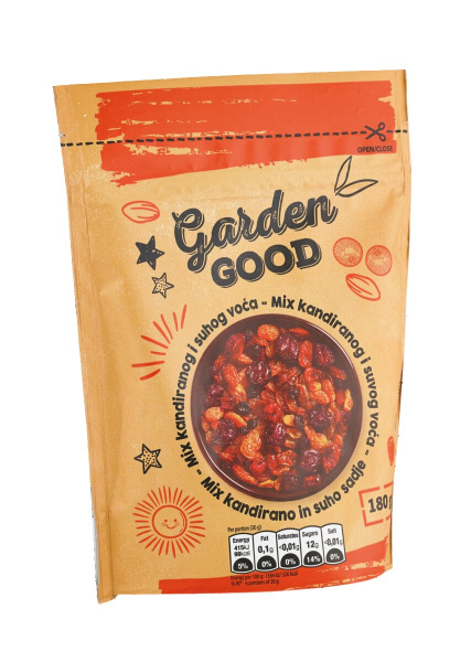 Suhe rozine 40% (rozine, konzervans: žveplov-dioksid), suhe višnje 20% (višnja 70%, sladkor), kandirane brusnice 20% (brusnica 55%, sladkor), suhe borovnice 10% (borovnica 70%, sladkor), suhi črni ribez 10% (črni ribez 70%, sladkor).