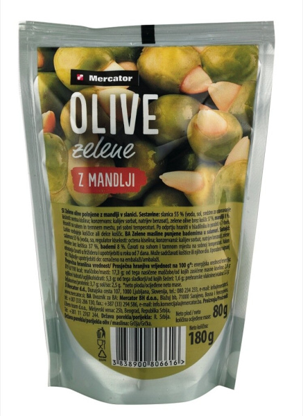 Zelene olive z mandlji, Mercator, 180 g
