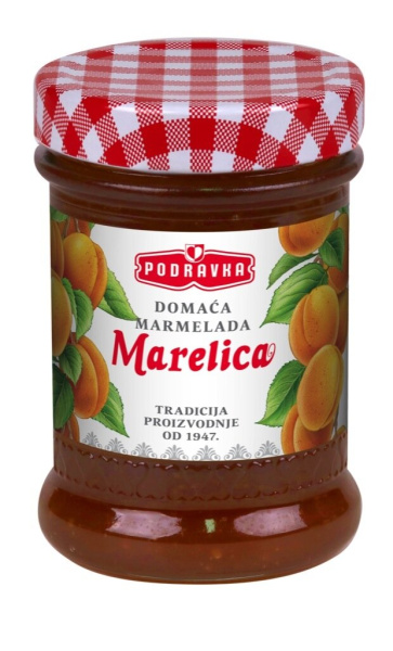 Sladkor, marelična kaša, želirno sredstvo pektin, sredstvo za uravnavanje kislosti citronska kislina. Izdelano iz 40 g sadja na 100 g izdelka.