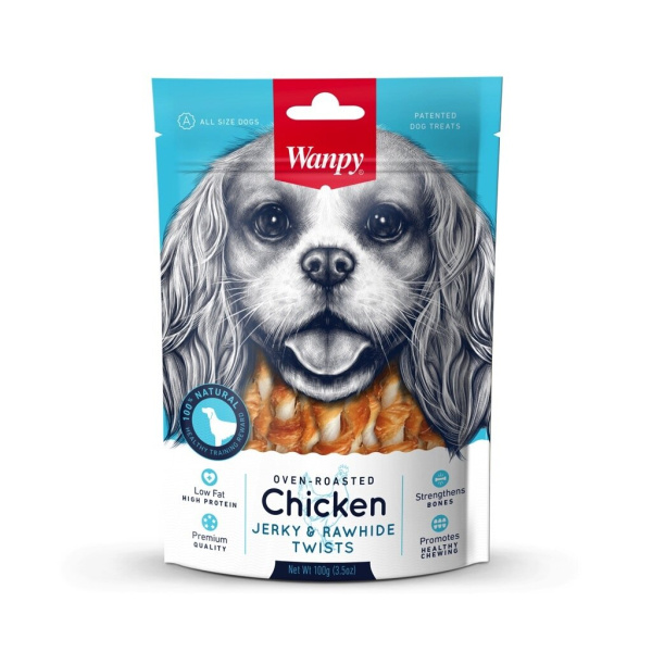 Prigrizek za pse iz surove kože s piščančjimi trakovi, Wanpy, 100 g