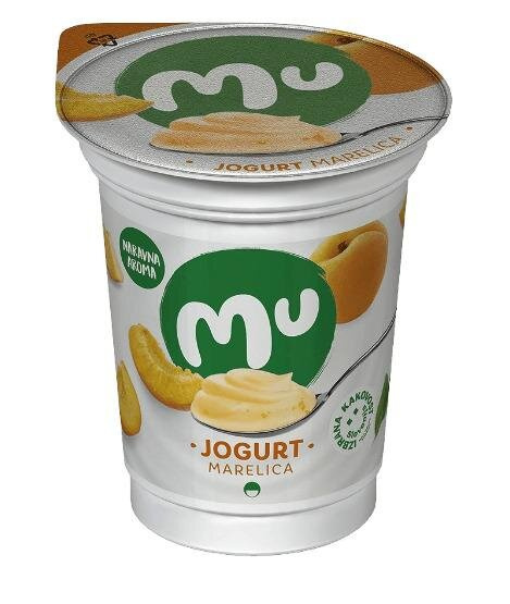 Pasterizirano MLEKO z 2,3 % MLEČNE maščobe, sadni pripravek 16 % (sladkor, marelična kaša iz zgoščenega soka 25 %, marelice 10 %, modificirani škrob, zgoščeni sokovi korenja, buče in limone, naravne arome), jogurtova kultura.